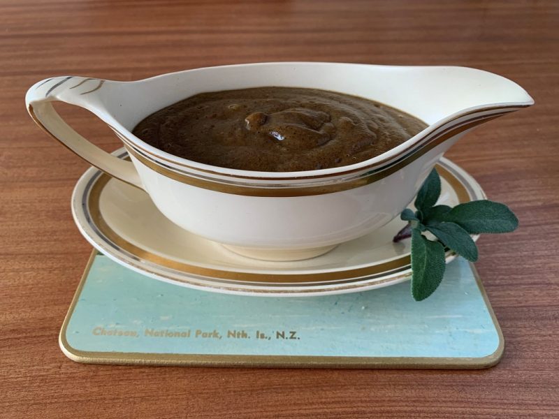 This is a thick, glossy gravy, that uses whole vegetables. Make it in bulk, and freeze portions for quick meals.